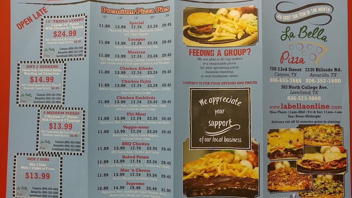 Welcome to La Bella Pizza Canyon, a delightful culinary gem located at 700 23rd St, Canyon, TX. Here, the menu offers a mouthwatering array of options, catering predominantly to pizza lovers and burger enthusiasts alike.